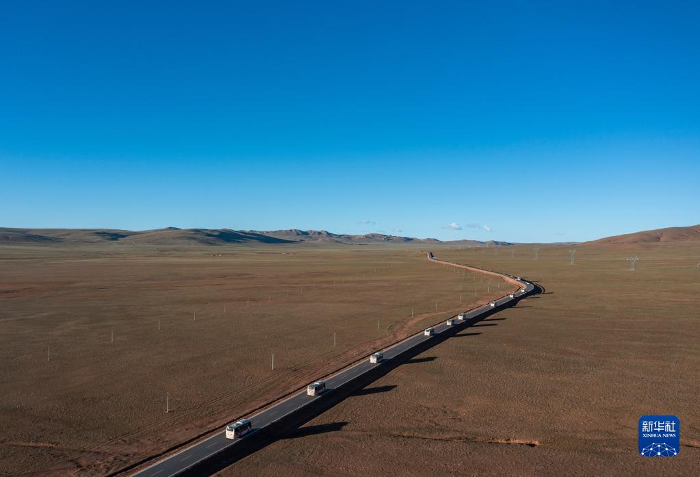 從雙湖縣出發(fā)的車隊行駛在前往森布日安置點的道路上(7月19日攝,無人機照片)。新華社記者 孫非 攝