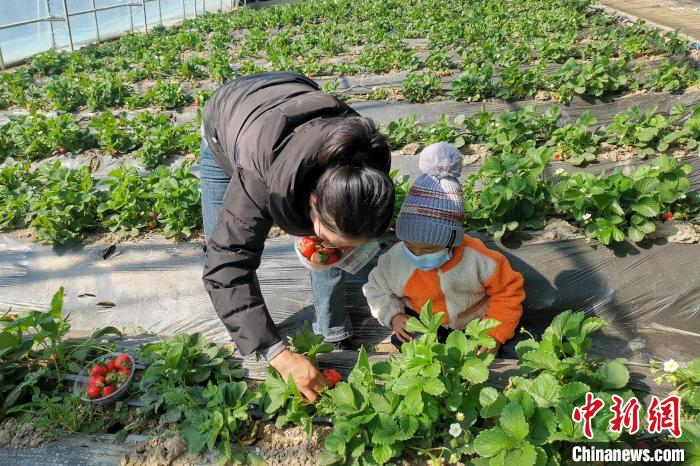 家長(zhǎng)帶孩子體驗(yàn)草莓采摘?!堄裣?攝