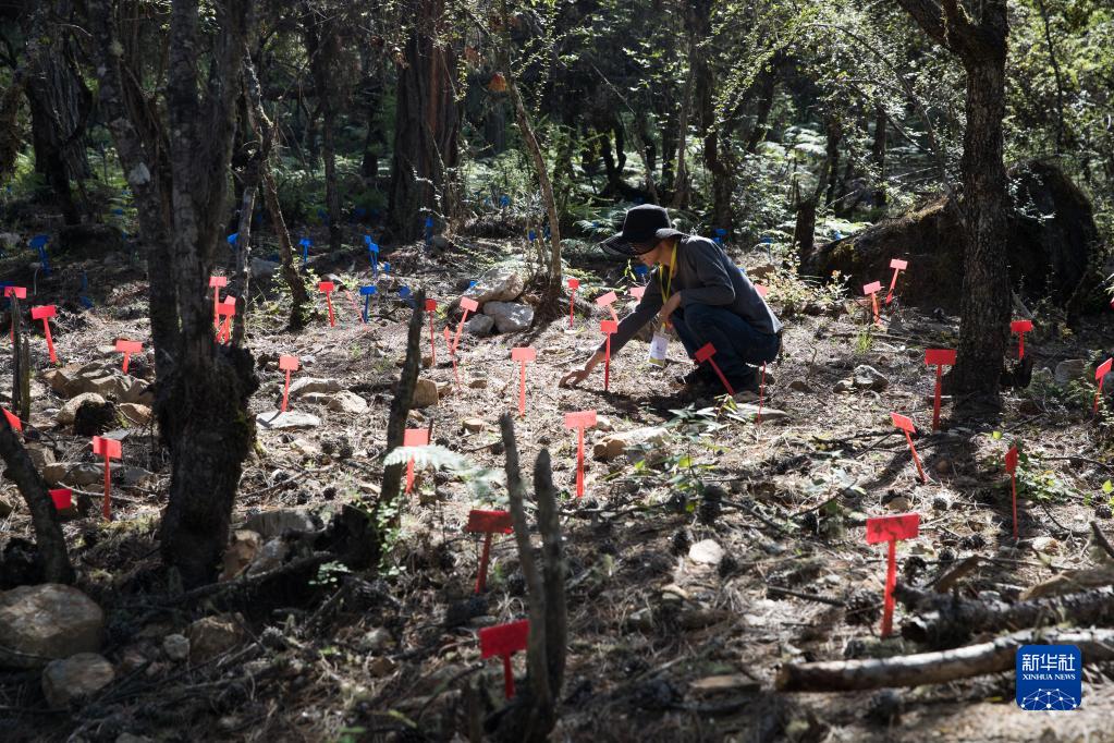 在波密縣扎木鎮(zhèn)東若村林地,工作人員在查看林下?lián)嵊牟靥炻槌砷L情況。新華社記者 金立旺 攝