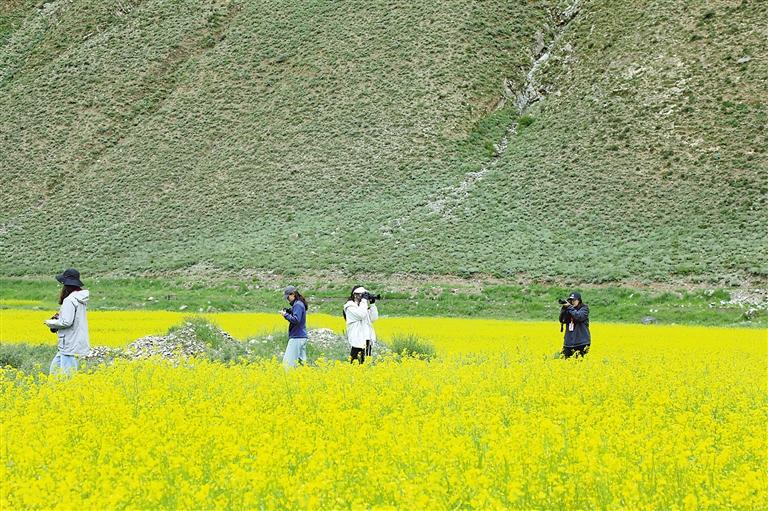 參加活動(dòng)的媒體記者在油菜花田里采風(fēng)。記者 格桑倫珠 攝