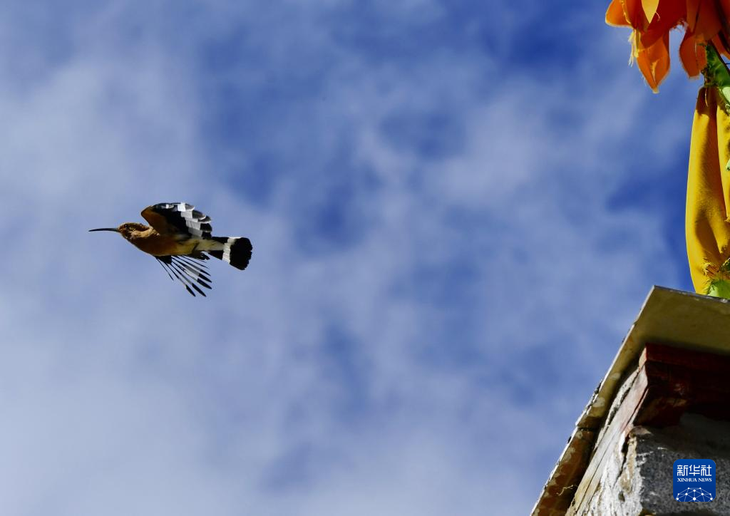 戴勝在白定村民居前飛翔(6月29日攝)。新華社記者 張汝鋒 攝
