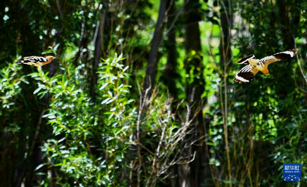 在白定村樹林里飛舞的戴勝(6月29日攝)。新華社記者 張汝鋒 攝