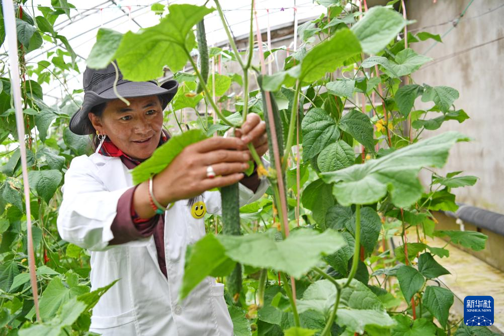 措勤縣高原生態(tài)畜牧業(yè)現(xiàn)代化養(yǎng)殖一體化產(chǎn)業(yè)綜合基地合作社社員白瑪在蔬菜大棚采摘黃瓜(8月19日攝)。新華社記者 張汝鋒 攝