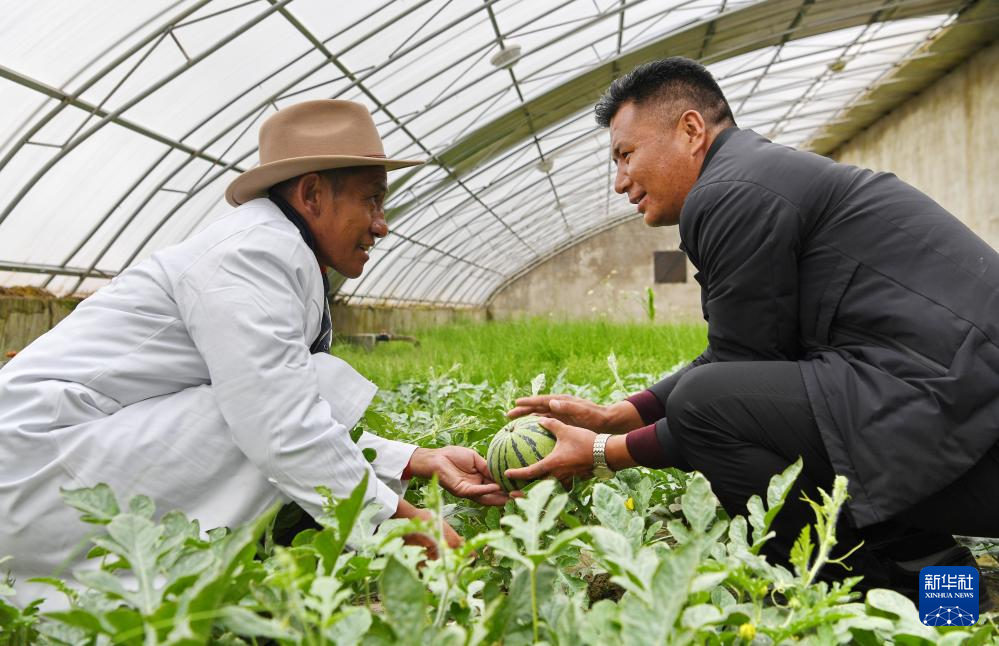 措勤縣農(nóng)牧業(yè)技術推廣站站長吾金次仁(右)和措勤縣高原生態(tài)畜牧業(yè)現(xiàn)代化養(yǎng)殖一體化產(chǎn)業(yè)綜合基地合作社負責人扎西桑布在西瓜大棚里交流(8月19日攝)。新華社記者 張汝鋒 攝