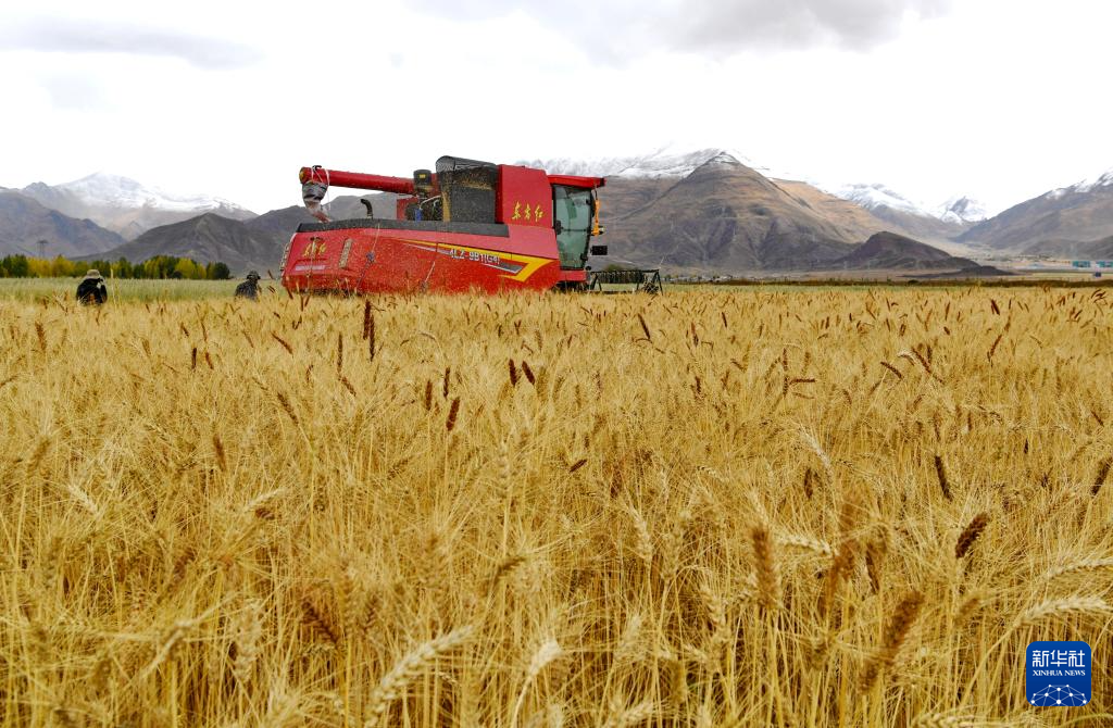??工作人員駕駛農(nóng)業(yè)機(jī)械在西藏拉薩市林周縣曲果強(qiáng)村的高標(biāo)準(zhǔn)農(nóng)田里收獲小麥(10月12日攝)。新華社記者 張汝鋒 攝