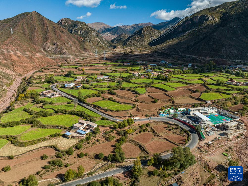 這是10月20日拍攝的西藏芒康縣如美鎮(zhèn)拉烏村(無人機(jī)照片)。圖中公路為國道318線。新華社記者 孫非 攝
