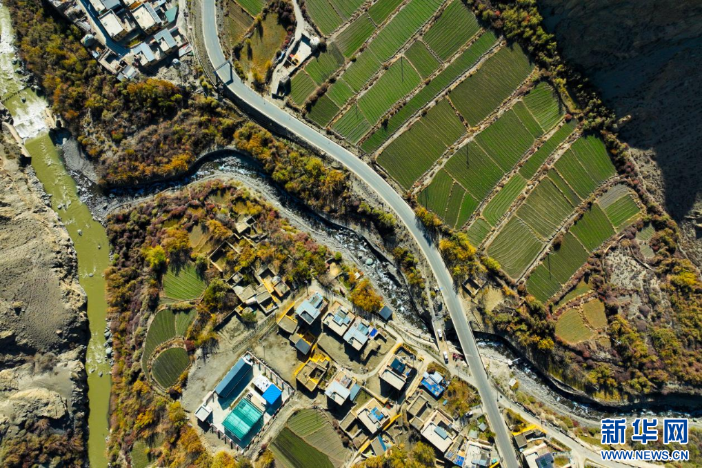 11月16日,西藏隆子縣加玉鄉(xiāng)境內(nèi)拍攝的村莊與農(nóng)田(無(wú)人機(jī)照片)。新華網(wǎng) 柑丹鴦琦 攝