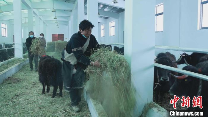 圖為多村“一合”牧民聯(lián)合專業(yè)合作社工作人員給牦牛喂飼料。益西 攝