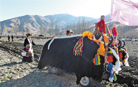 喝完青稞粥,多吉曲珍全家一起出動去社區(qū)高標準農(nóng)田參加春耕儀式。