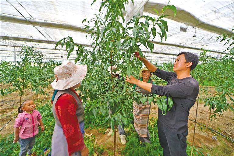 圖為尼木縣“點(diǎn)對(duì)點(diǎn)”干部王榮華(右一)向群眾傳授平谷大桃種植技術(shù)。