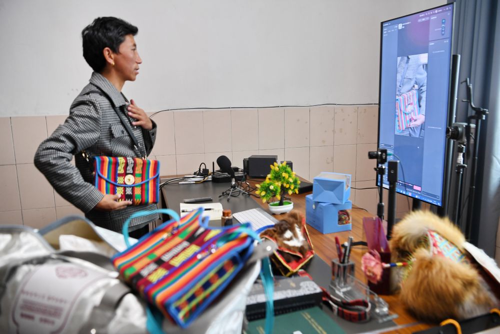 倉秋多吉通過網(wǎng)絡銷售當?shù)氐漠a(chǎn)品(8月24日攝)。