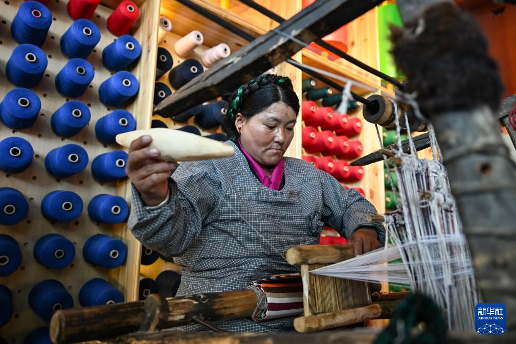 氆氌是藏族群眾用來制作藏式衣物的毛織品,其工藝迄今已有上千年歷史。在上海援藏幫扶下,這項傳統(tǒng)技藝如今已成為當?shù)亍鞍⒓选保ú卣Z意為“大姐”)們的致富新途徑,煥發(fā)出新的生機。