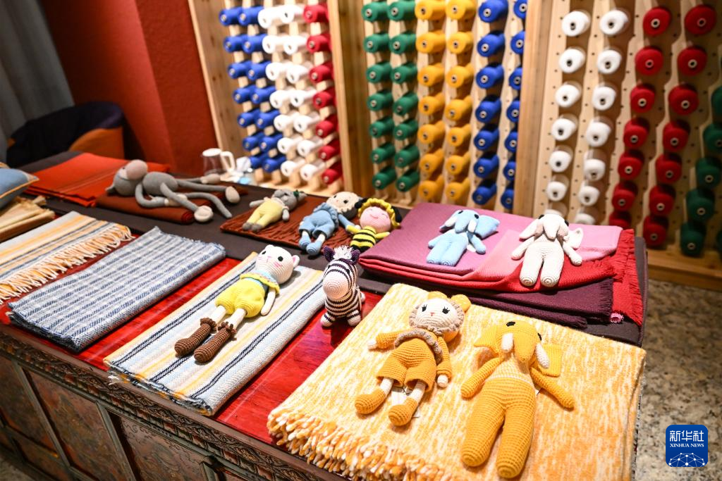 這是在西藏日喀則市一間門店拍攝的玩偶、圍巾、披肩等江孜氆氌產品(9月1日攝)。新華社記者 孫瑞博 攝