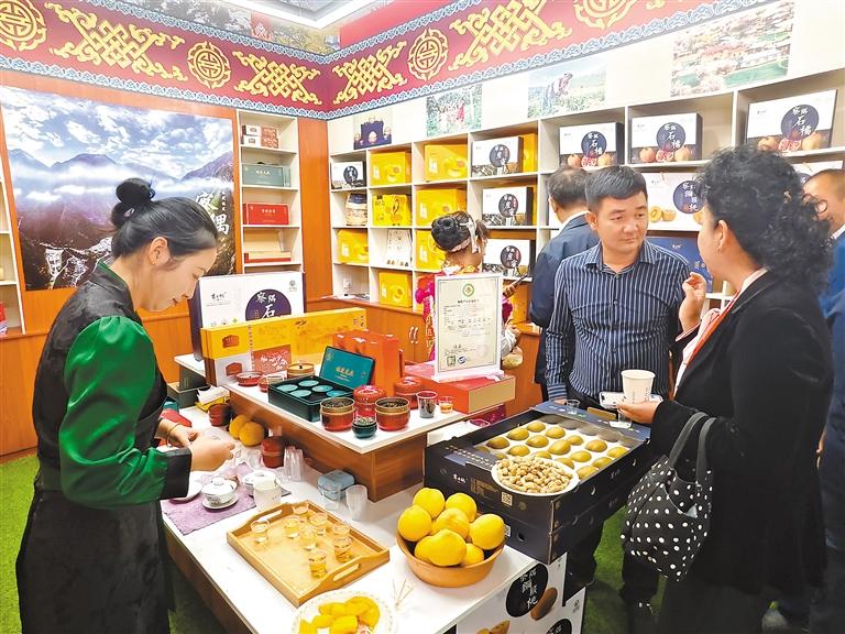 察隅縣供銷合作社工作人員在林芝城市會客廳內(nèi)展示農(nóng)特產(chǎn)品薏仁。