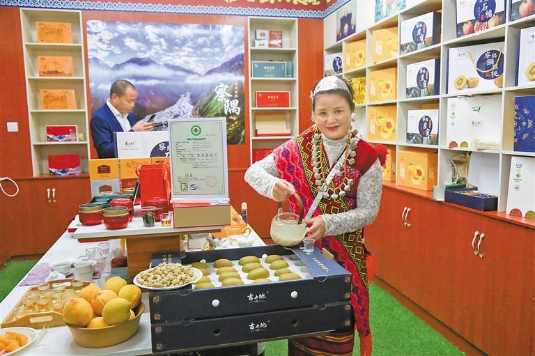 察隅縣供銷合作社工作人員向群眾推銷察隅花生和黃桃、獼猴桃等農(nóng)特產(chǎn)品。