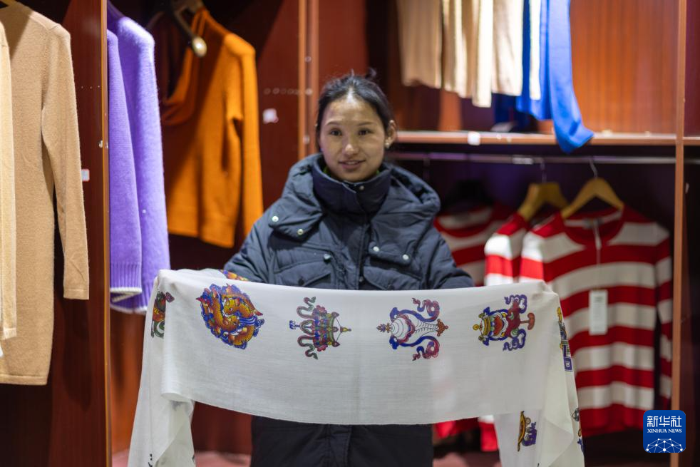 措勤縣的銷售人員在展示用紫山羊絨為原料制作的印有八寶圖案的哈達(dá)(11月20日攝)。新華社記者 姜帆 攝
