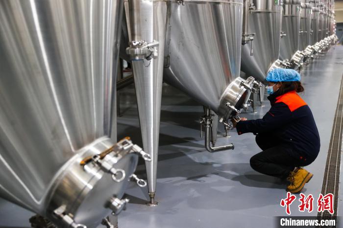 圖為工作人員檢查儲酒罐。中新社記者 薛蒂 攝