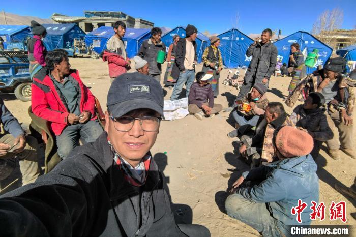 圖為1月11日,西藏定日6.8級地震后,鐵路職工桑杰尼瑪和村民們在一起。受訪者 供圖