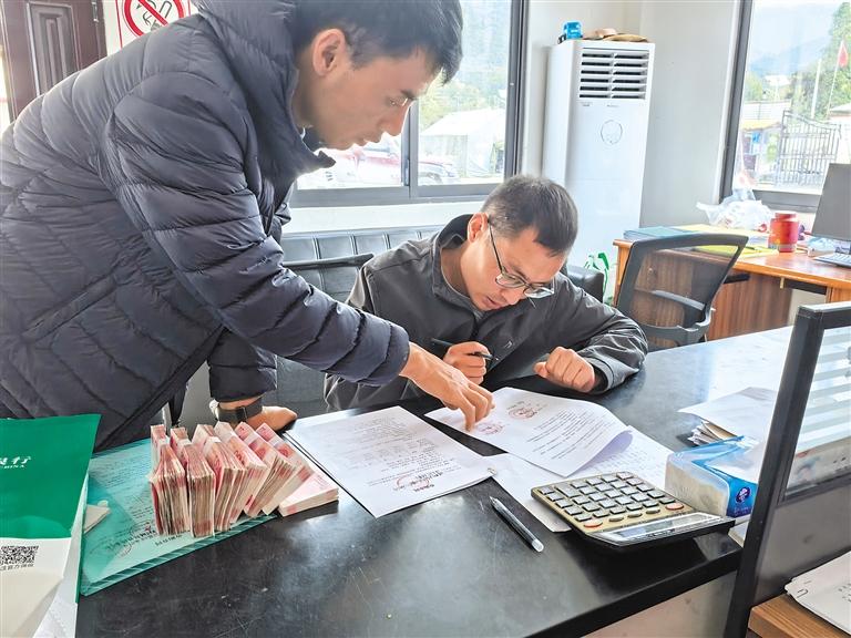 墨脫縣新創(chuàng)農(nóng)業(yè)科技開發(fā)公司工作人員為波東村種植戶結(jié)算靈芝款。圖/文 記者 王珊 劉楓