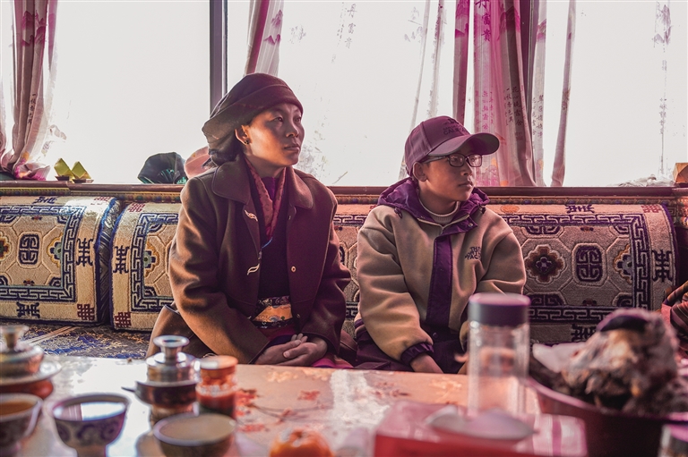 當(dāng)日,天空晴朗,在廣袤無(wú)垠、無(wú)樹(shù)木遮擋的曠野上,稍起一陣疾風(fēng),便會(huì)揚(yáng)起一層薄薄的黃沙。從村委會(huì)出發(fā),沿著冰湖畔的水泥小路前行,很快就來(lái)到了村民倫珠曲珍的家。一進(jìn)屋,厚實(shí)的木門(mén)便將凜冽的寒風(fēng)擋在了門(mén)外?!翱煺?qǐng)進(jìn),這幾天風(fēng)沙有點(diǎn)大,普莫雍措都沒(méi)以前藍(lán)了。”倫珠曲珍一邊關(guān)門(mén)一邊熱情地笑著說(shuō)道。
