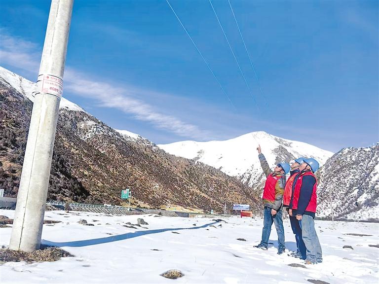 圖為國網(wǎng)工布江達(dá)縣供電公司工作人員在檢查線路。記者 劉楓 謝筱純 通訊員 多吉旺堆 張民澤 攝
