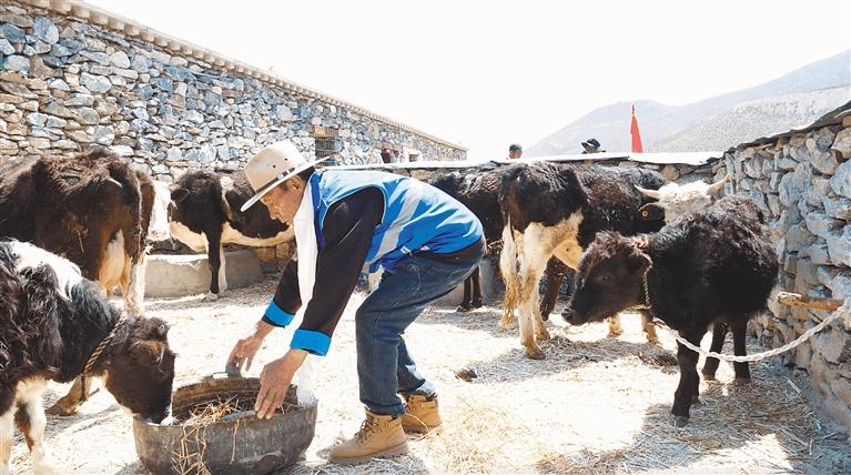 村民在新建的集中飼養(yǎng)牛圈里照料牲畜。