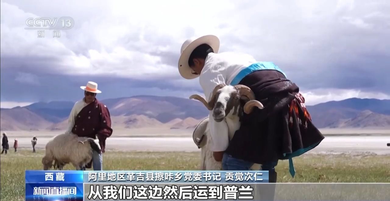 阿里地區(qū)革吉縣擦咔鄉(xiāng)黨委書(shū)記 貢覺(jué)次仁:歷史時(shí)期,我們這邊采鹽的湖稱(chēng)作章倉(cāng)三湖。鹽以綿羊作為交通工具,每只綿羊大概背20斤左右,從我們這邊運(yùn)到普蘭、日喀則,到印度、尼泊爾等地,以物易物的方式進(jìn)行交易。
