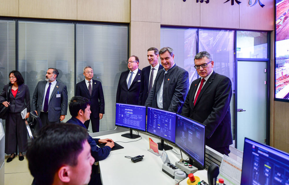 德國(guó)巴伐利亞州州長(zhǎng)索德?tīng)枺ㄓ叶┮恍衼?lái)到中德合作的磁懸浮成都試驗(yàn)線列車運(yùn)控中心參觀。新華社記者張超群攝