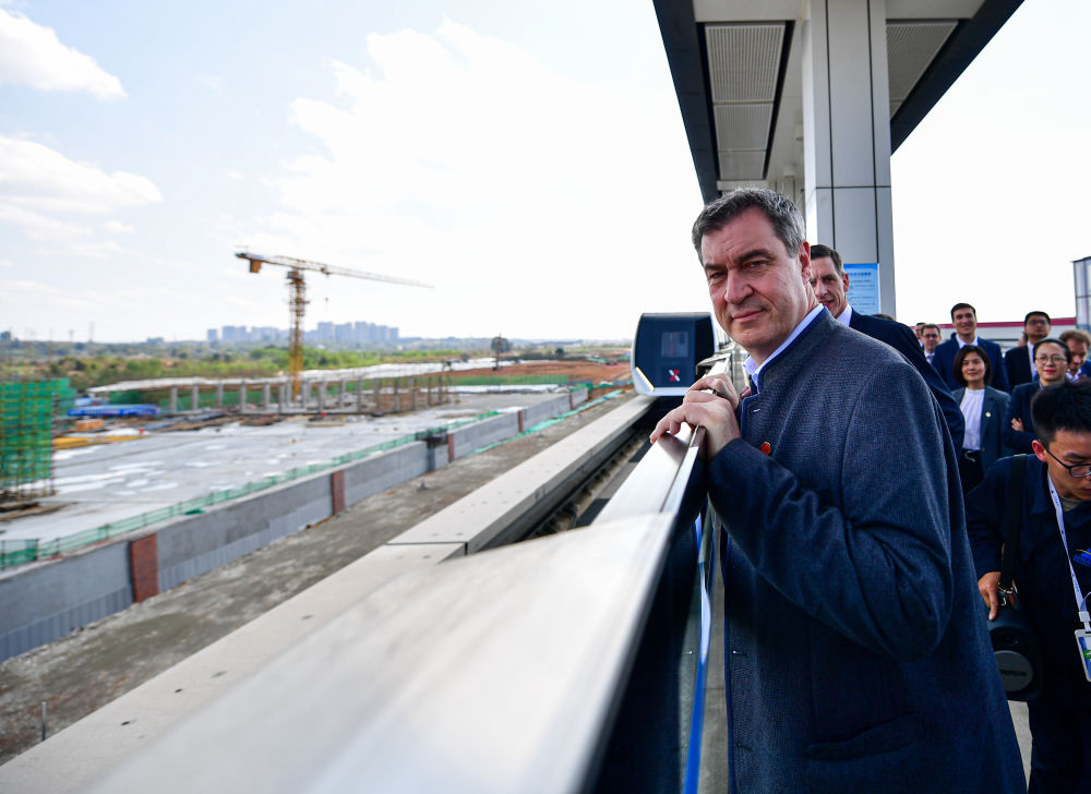 德國(guó)巴伐利亞州州長(zhǎng)索德?tīng)枺ㄗ蠖┮恍畜w驗(yàn)中德合作的磁懸浮成都試驗(yàn)線。新華社記者張超群攝