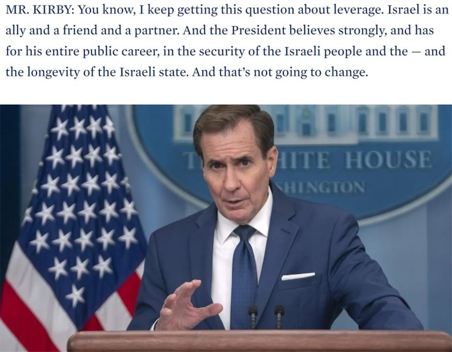 白宮國(guó)家安全委員會(huì)戰(zhàn)略溝通協(xié)調(diào)員柯比當(dāng)天在記者會(huì)上被反復(fù)追問(wèn)“美國(guó)是否會(huì)切斷對(duì)以色列的武器供應(yīng)”時(shí)一味回避躲閃,但在回答美以關(guān)系問(wèn)題時(shí)卻斬釘截鐵。