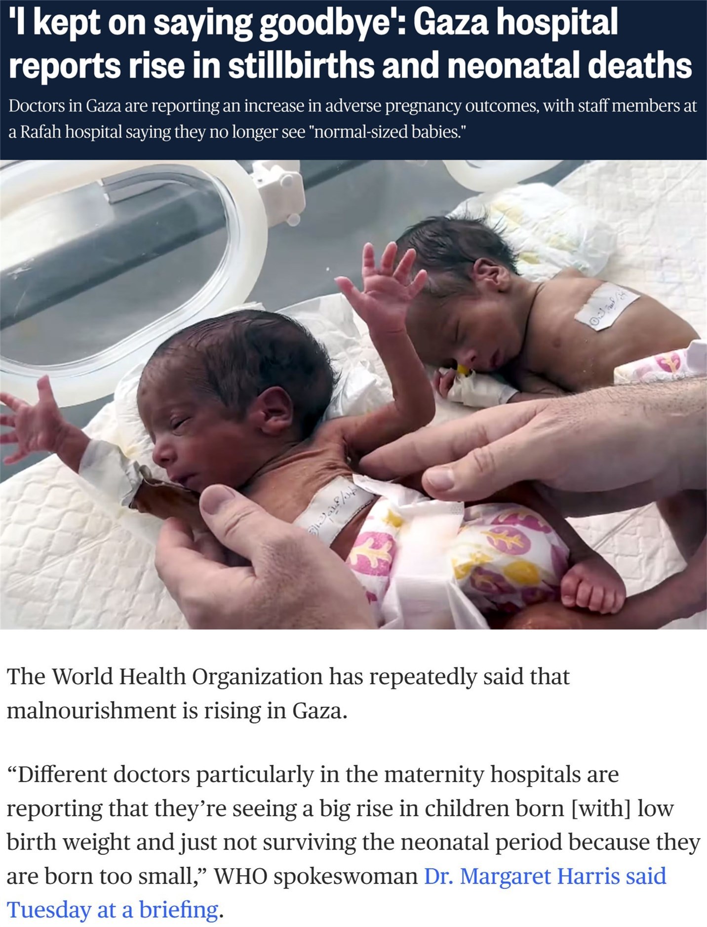 世界衛(wèi)生組織日前警告,加沙新生兒的死亡率正在直線上升。此外,還有大量嬰兒的體重達(dá)不到正常標(biāo)準(zhǔn),導(dǎo)致他們過(guò)早夭折。