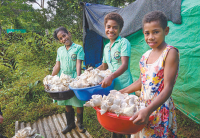 中國政府面向斐濟等太平洋島國推廣菌草技術,推動當?shù)亟?jīng)濟發(fā)展,助力當?shù)孛裆纳?。圖為在斐濟奈塔希里乳業(yè)婦女組織菌草技術示范點,孩子們正在幫忙采菇。