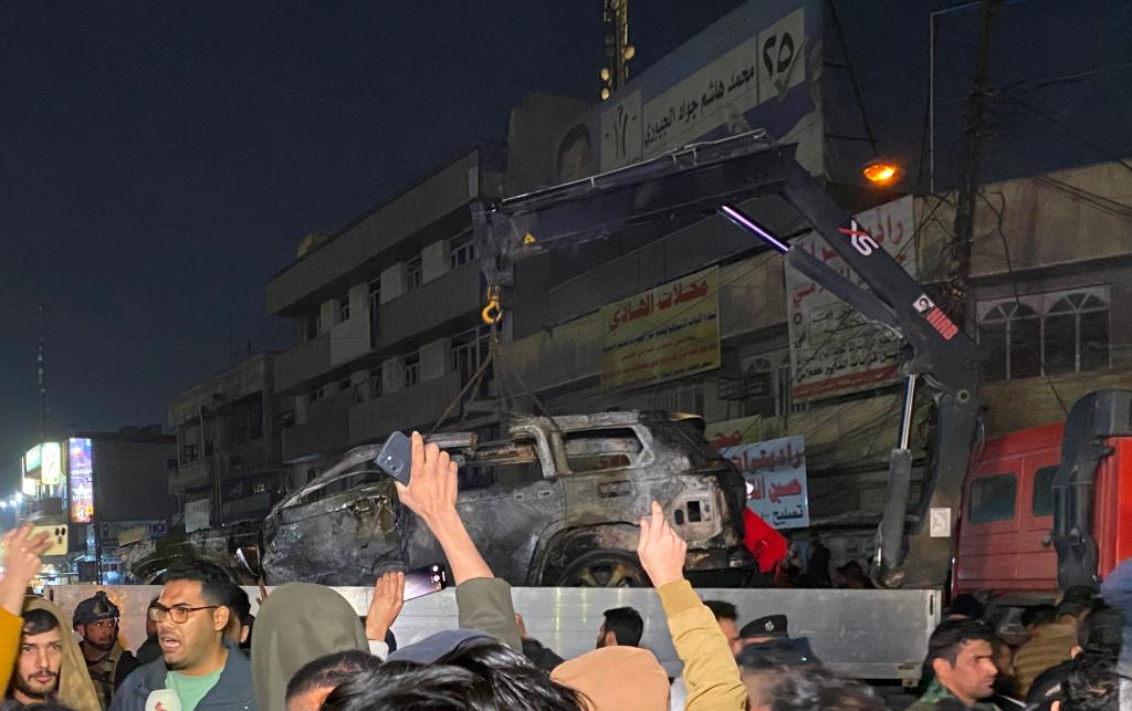 2024年2月7日,在伊拉克首都巴格達(dá),民防部門轉(zhuǎn)移遭無人機(jī)襲擊的車輛。新華社發(fā)(哈利勒·達(dá)伍德攝)