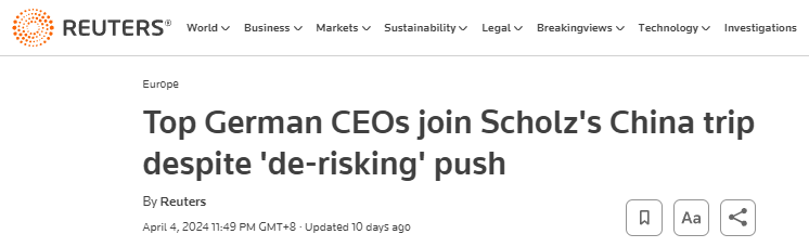 路透社分析稱,這份高管名單,凸顯了中國作為德國最大貿(mào)易伙伴的“重要份量”。