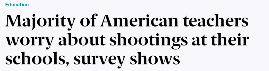 美國獨立新聞媒體The 19th 網(wǎng)站11日報道稱,根據(jù)皮尤研究中心一項新的調(diào)查,絕大多數(shù)美國K-12公立學校的教師在一定程度上擔心學??赡軙l(fā)生槍擊事件。并且,多數(shù)教育工作者贊成對學生們進行更多心理健康篩查和治療并反對教職工配槍上班。