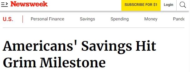 美國富國銀行(Wells Fargo)分享給《新聞周刊》(Newsweek)的一份分析報告顯示,美國人的儲蓄速度正在下降,達到一年多來的最低水平。與此同時,另一項調查指出,近38%的美國人不得不動用儲蓄或求助家人朋友以應對日常支出。有超過半數的美國人認為通脹是美國當前面臨的一個比移民和犯罪等更大的問題。