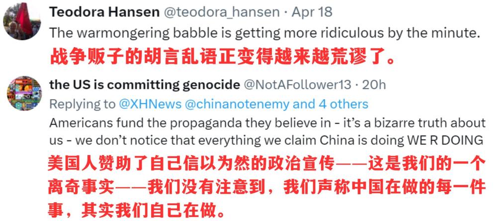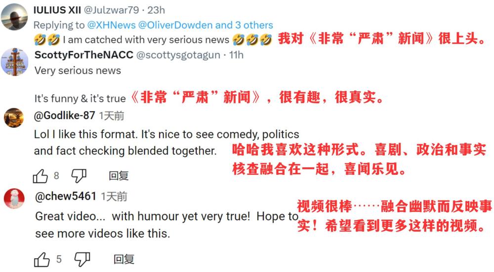 脫口秀播發(fā)后,英國議會(huì)議員喬治·加洛韋、倫敦廣播公司主持人丹尼絲·黑德利、倫敦都市大學(xué)副教授康斯坦丁諾斯·皮塔基、美國反戰(zhàn)組織“粉色代碼”等機(jī)構(gòu)和個(gè)人賬號(hào)紛紛轉(zhuǎn)贊評(píng)。網(wǎng)友們在評(píng)論區(qū)呼吁:這樣有趣又有料的節(jié)目,多多益善!