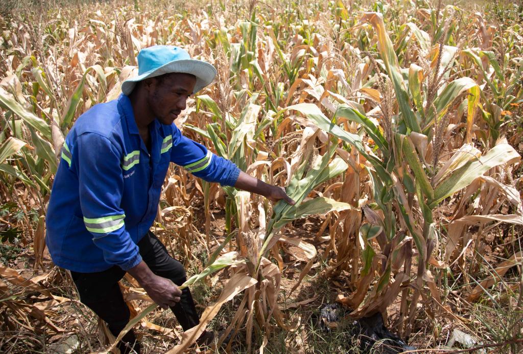 4月3日,農(nóng)民在津巴布韋首都哈拉雷近郊的一塊玉米地檢查作物長(zhǎng)勢(shì)。津巴布韋總統(tǒng)姆南加古瓦宣布,由于厄爾尼諾現(xiàn)象造成嚴(yán)重干旱,全國(guó)進(jìn)入災(zāi)害狀態(tài)。新華社發(fā),肖恩·朱薩攝