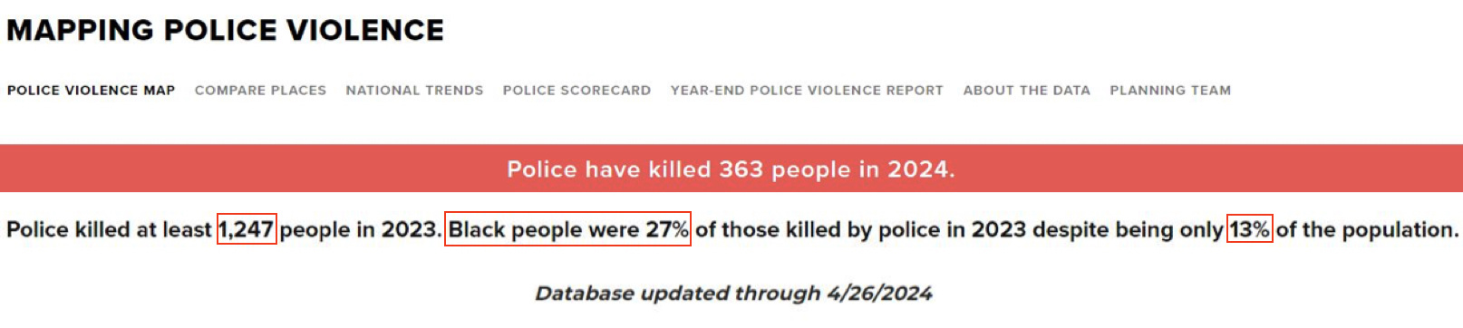 而今年截至4月26日最后一次數(shù)據(jù)更新,全美在不到四個(gè)月時(shí)間里已有363人命喪警察之手。