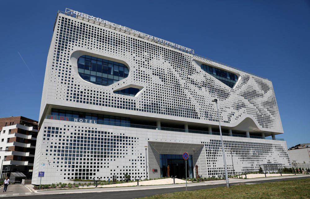 2024年4月28日在塞爾維亞首都貝爾格萊德拍攝的中國文化中心。建筑外立面通過精巧的設(shè)計(jì),融入了中國山水畫理念。