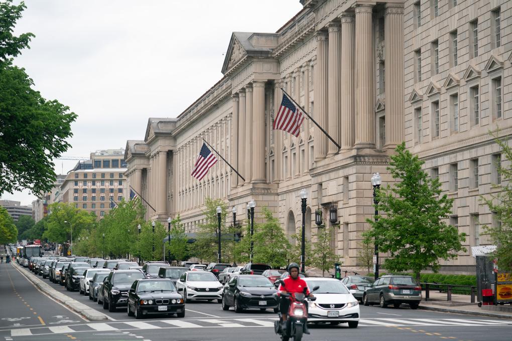 這是4月25日在美國(guó)首都華盛頓拍攝的商務(wù)部大樓。新華社記者劉杰攝