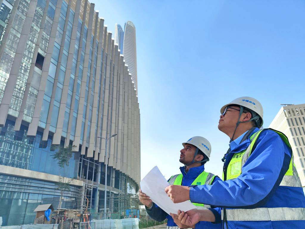 2023年11月27日,中建深圳裝飾有限公司項(xiàng)目經(jīng)理徐笑笑(右)與來(lái)自埃及的幕墻工程師艾哈邁德·賽義德在埃及開(kāi)羅以東的埃及新行政首都中央商務(wù)區(qū)施工現(xiàn)場(chǎng)一同查看幕墻安裝進(jìn)度(手機(jī)拍攝)。新華社發(fā)(中建深圳裝飾有限公司供圖)