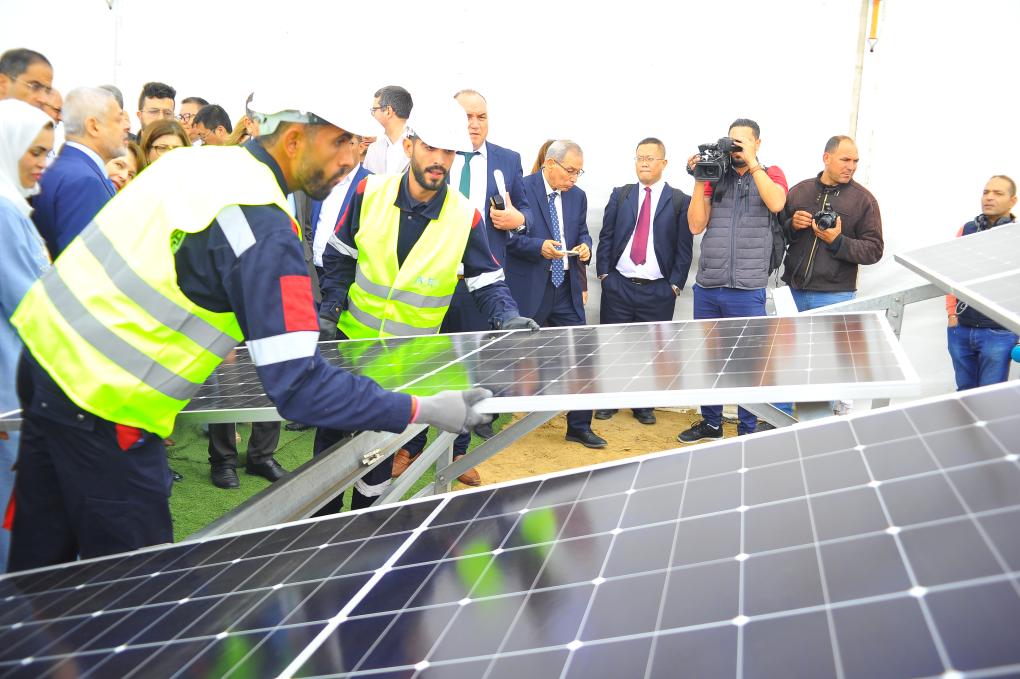 2024年5月8日,在突尼斯凱魯萬省,兩名工人演示安裝太陽能光伏板。新華社發(fā)(阿代爾攝)