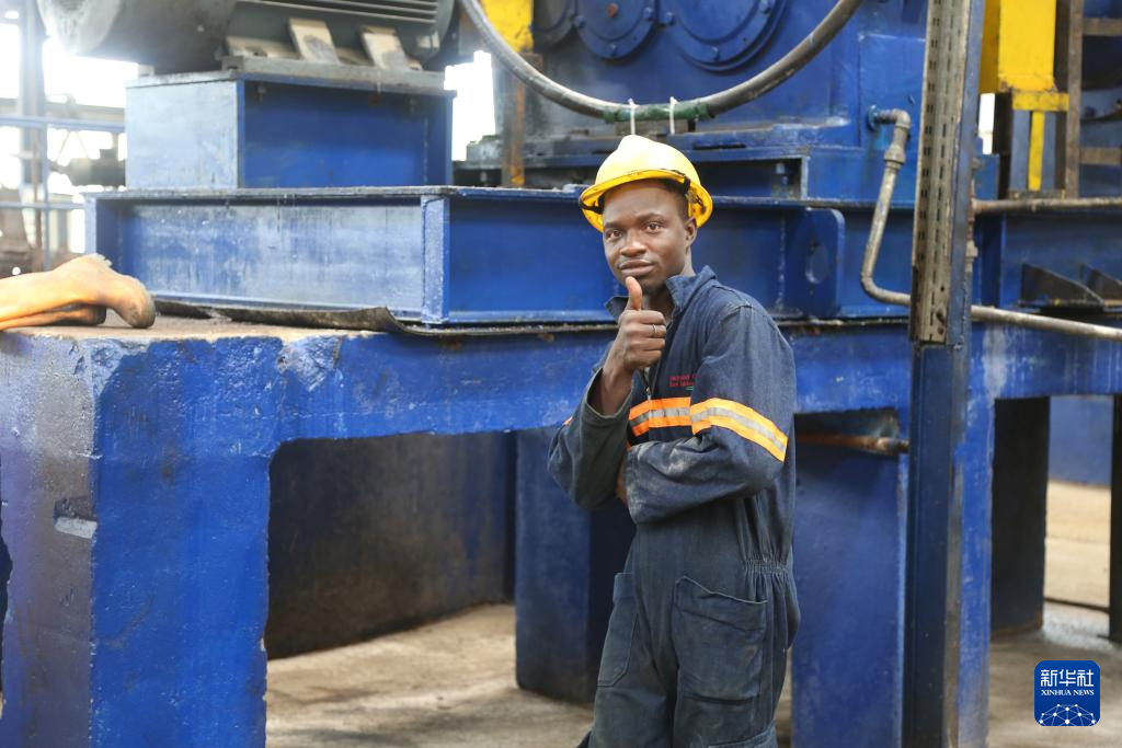 2024年6月10日,在科特迪瓦南部城鎮(zhèn)達布郊區(qū),美蘭橡膠加工廠工人在機器旁豎起大拇指。新華社記者 張健 攝