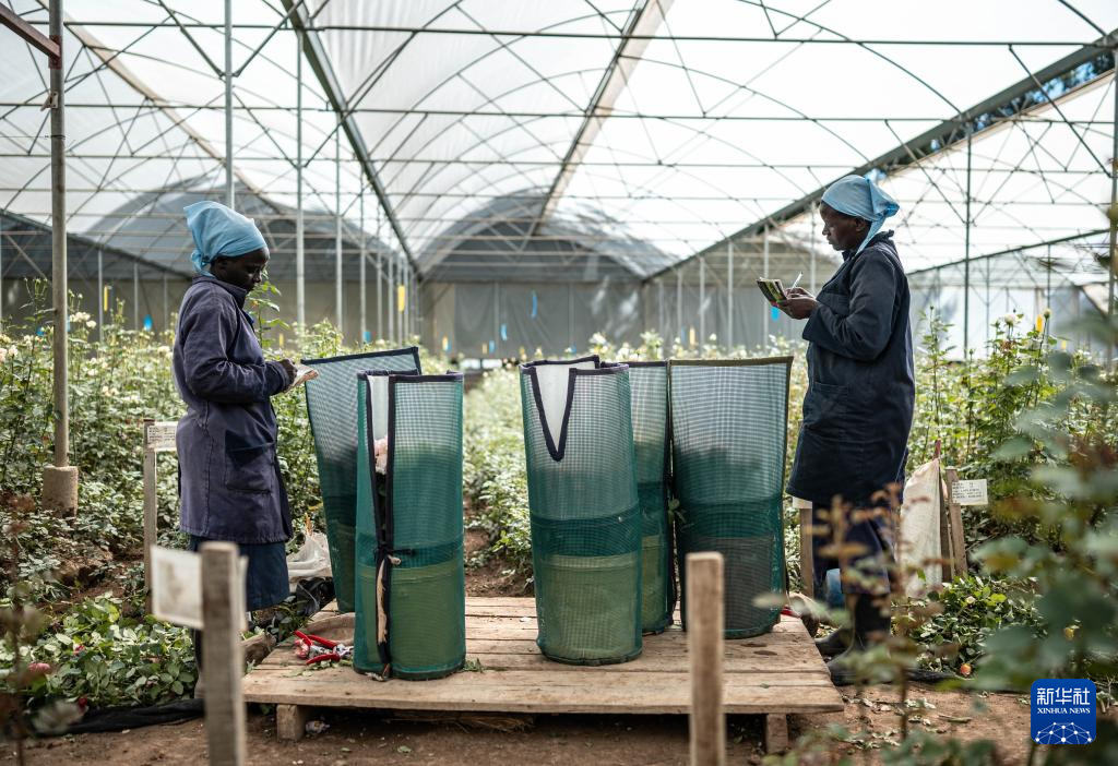2024年5月18日,湖南璽悅國際貿易有限公司負責人黃梓楠(右)在肯尼亞納紐基的坦布濟花卉農場挑選鮮花。新華社記者 王冠森 攝
