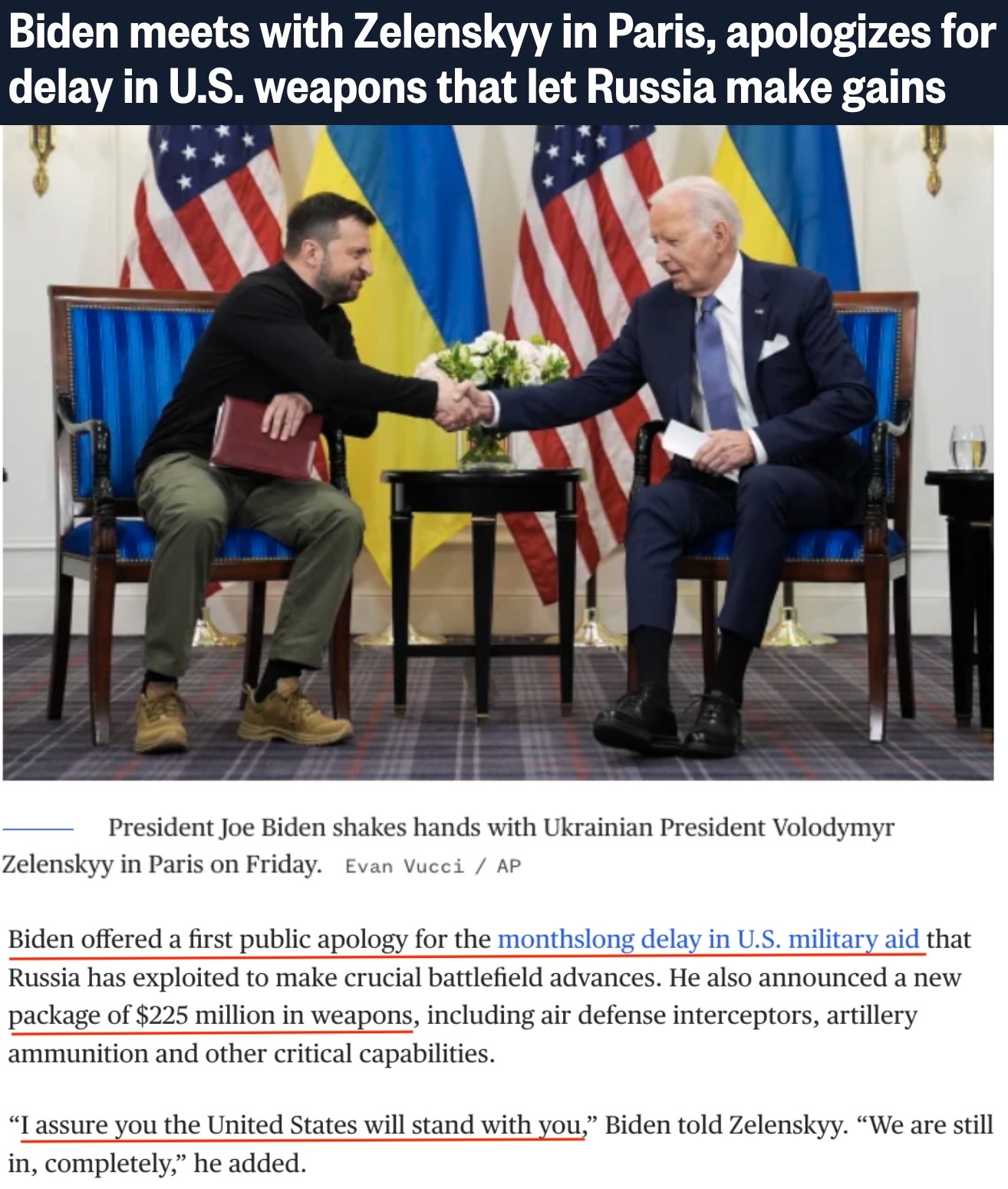 在巴黎會(huì)見烏克蘭總統(tǒng)澤連斯基時(shí),拜登首次就美國(guó)國(guó)會(huì)未能更早通過對(duì)烏新援助法案“道歉”,并宣布將再向?yàn)蹩颂m提供2.25億美元援助。