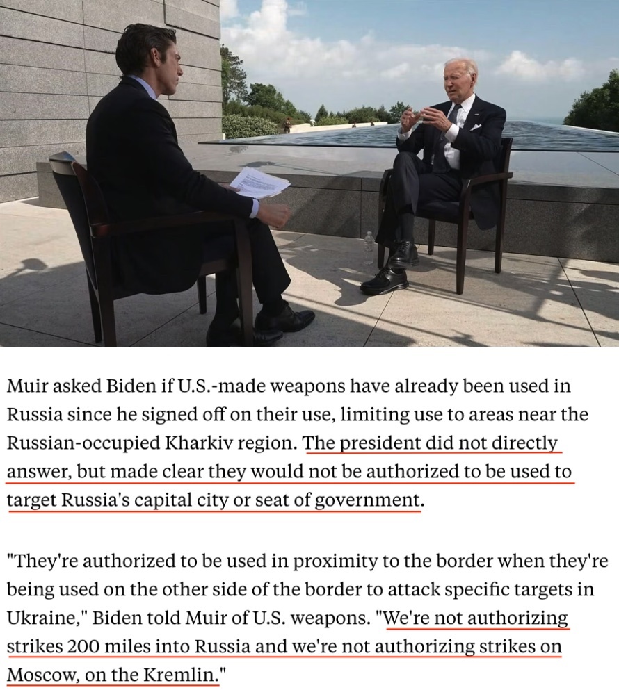 “它們(這些武器)被授權(quán)在(烏俄)邊境附近使用……我們沒有授權(quán)(烏克蘭)向俄羅斯境內(nèi)200英里(約合320公里)的地方發(fā)動(dòng)襲擊,也沒有授權(quán)對(duì)莫斯科、克里姆林宮進(jìn)行打擊?!?/p>