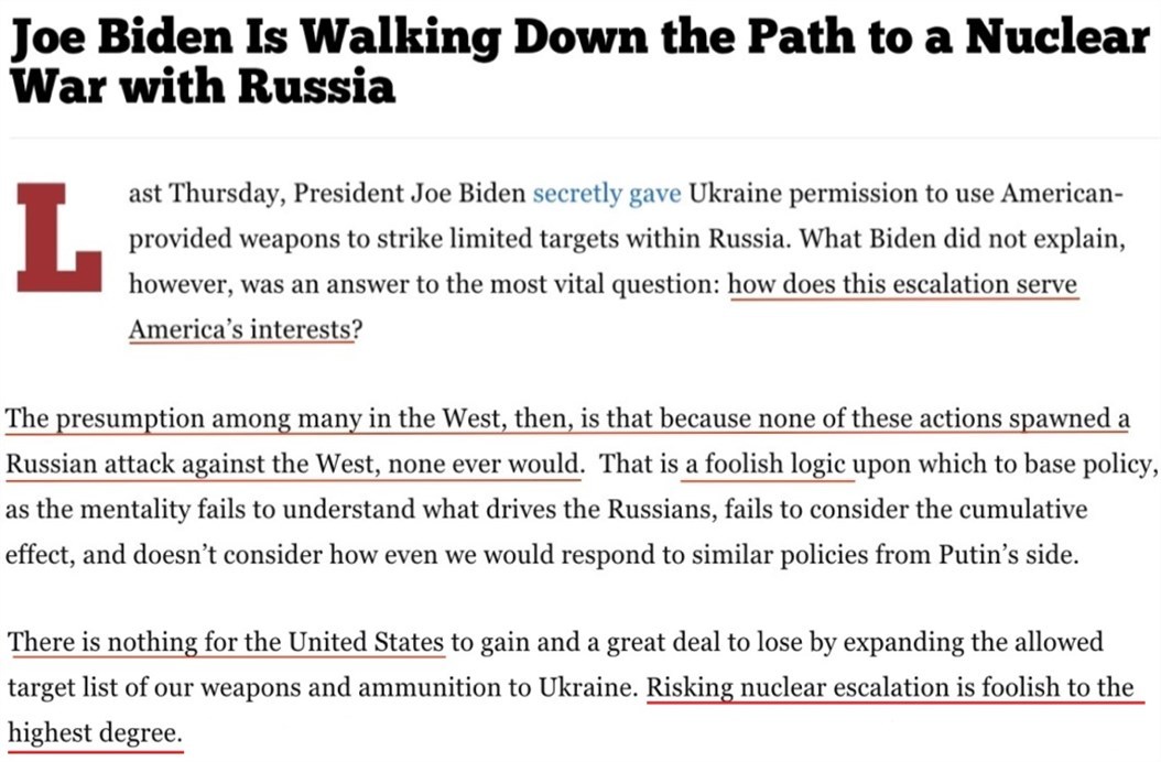 文章認(rèn)為,允許烏克蘭擴(kuò)大美援武器的打擊范圍對(duì)美國(guó)有百害而無一利。在美國(guó)安全并未受到威脅的情況下,冒險(xiǎn)與俄羅斯爆發(fā)核戰(zhàn)爭(zhēng)簡(jiǎn)直“蠢透了”。