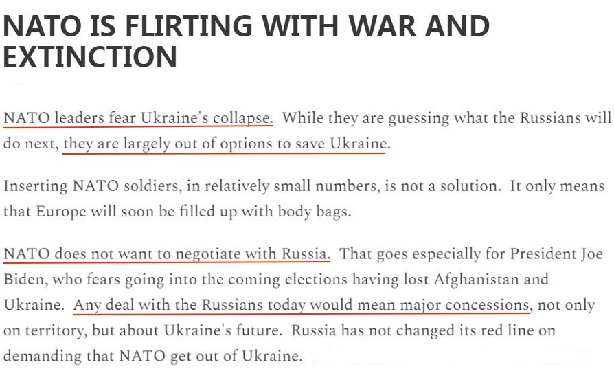 美國(guó)記者、前國(guó)防部官員斯蒂芬·布萊恩日前發(fā)表題為《北約正把戰(zhàn)爭(zhēng)和滅亡當(dāng)兒戲》的文章指出,雖然北約的領(lǐng)導(dǎo)人們擔(dān)心烏克蘭崩潰,而且他們?cè)诤艽蟪潭壬暇炔涣藶蹩颂m,但卻不想與俄羅斯談判。美國(guó)總統(tǒng)拜登尤其如此。