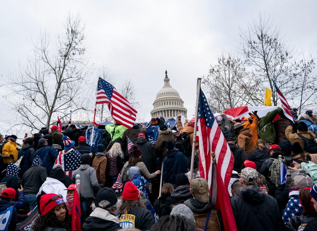 2021年1月6日,在美國首都華盛頓,時任總統(tǒng)特朗普的支持者在國會外舉行示威游行,部分示威者沖進(jìn)國會大廈,與警方發(fā)生沖突,造成一人死亡,當(dāng)時正在舉行的認(rèn)證大選結(jié)果的國會參眾兩院聯(lián)席會議也被迫中斷。新華社記者劉杰攝